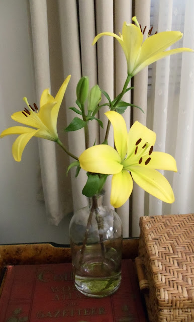 The first one is really simple...just a glass bottle with the two lily stems. That's in the family room.